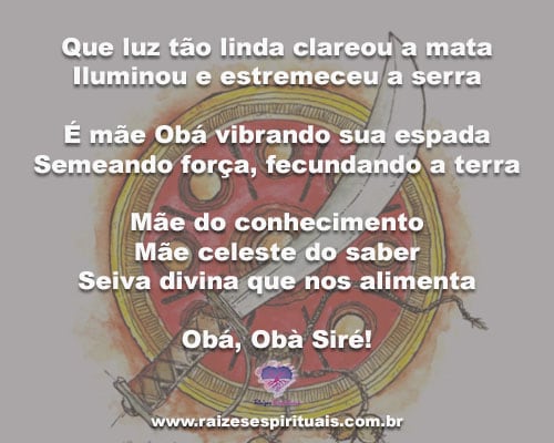 “Neste momento, Mãe Obá, seja por falta de atenção, falta de conhecimento ou mesmo ausência de harmonia entre eu e meus irmãos, as nossas atividades, as nossas dificuldades encontram-se desordenadas, mas com a força e poder do Seu Axé tudo poderá ser resolvido da melhor maneira possível de acordo com o merecimento de cada um. Minha querida Mãe Obá, derrame sobre nós Tua bênção trazendo harmonia, equilíbrio e concentração. Mãe Obá que Tua Luz ilumine nossos caminhos na busca do conhecimento e da harmonia, trazendo solução aos nossos problemas e paz aos nossos corações. Que assim seja! E assim será!”